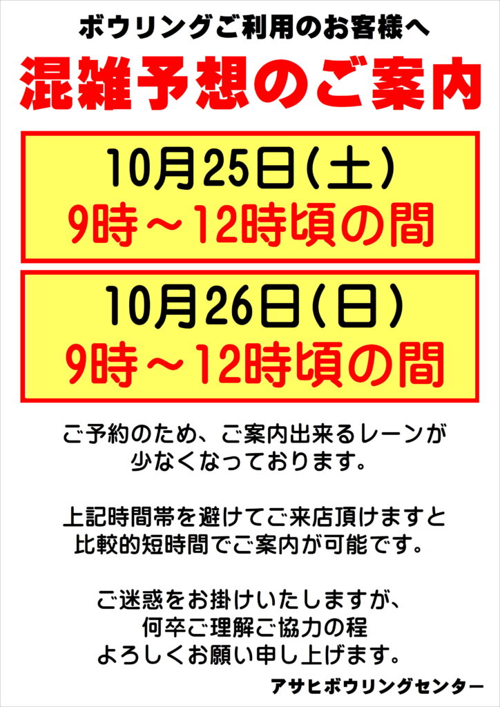 10月25日(土)、26日(日)混雑予想のお知らせ